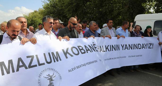 Kobenê'ye destek vermek için sınır kapısına gelen Alevi dernekleri, Kobanê devriminin inançların ve halkların güvencesi olduğu..
